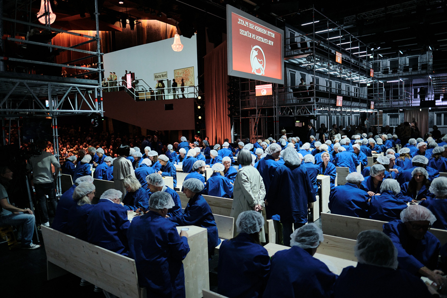 Ist die Frage des Aufbaus der gesamten Raumbühne spielplandramaturgisch schon komplex, weil Repertoirefragen im großen Stil entstehen, wird es zwischen den Produktionen auch künstlerisch vertrackt. Umbauten zwischen Stücken folgen in Raumbühnen anderen Gesetzmäßigkeiten, weil diese in der Regel auch Lagerflächen der Seiten- und Hinterbühnen ganz oder teilweise belegen. Das wäre schon Herausforderung genug – viel schwerer wiegt jedoch, dass Umbauten, die den Raum komplett verwandeln, weitaus aufwändiger sind als im Guckkasten: einerseits, weil ein Gerüst optisch immer ein Gerüst bleibt, der Aufwand für grundlegende Raumtransformationen also groß ist. Andererseits, weil eine Komplettverwandlung mehr als doppelt so viel blanke Bühnen- und Wandfläche betrifft, als wenn es nur um die klassische Sichtachse durchs Bühnenportal ginge. Das klingt unrealisierbar, aber inszenatorisch wird es hier erst interessant, denn Bühnenbild funktioniert in Raumbühnen anders. Nicht illusionistische Komplettverwandlungen sind der Schlüssel, sondern andere Logiken des Raums, die aus dem partizipativen Ansatz dieser Anordnung kommen. Wir haben als künstlerische Leitung daher bei allen Raumbühnenprojekten seit 2016 darauf hingewirkt, dass die Teams der verschiedenen Produktionen miteinander sprechen, um den gewaltigen Aufwand synergetisch zu lösen. Häufig haben sich verschiedene Stücke in der Vergangenheit bestimmte Ausstattungsteile geteilt, um so große Dimensionen realisieren zu können (und so dann ein implizites stückübergreifendes Geflecht aus Ausstattungsbezügen geschaffen: eine visuelle Identität über die gesamte Spielzeit). Für die Raumbühne ANTIPOLIS gestaltete Sebastian Hannak, um dieses Prinzip auf die Spitze zu treiben, mehrere Grundausstattungen (z.B. für Don Giovanni und Hamletmaschine ein Schachbrettmuster auf dem Boden und an den Wänden, das den ursprünglich einer Stadtlandschaft nachempfundenen Raum fundamental veränderte.) Das Schachbrett, das Denken in schwarz-weiß, war damit der visuelle Rahmen mehrerer Produktionen und ihre stückübergreifende gedankliche Verbindung.