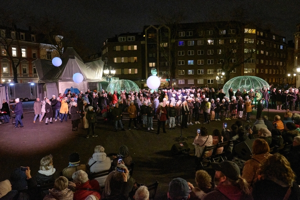 Am Ende der Aufführung ist es dunkel geworden, nur wenige Fenster der umliegenden Häuser sind erleuchtet. Während der letzten Klänge von Schuberts Leiermann („Drüben hinterm Dorfe“) tauchen die Scheinwerfer die Spielfläche in eisblaues Licht: Ein Moment größter Verzweiflung und Einsamkeit entsteht. Doch die Aufführung ist an diesem Punkt noch nicht zu Ende, denn es folgt ein von allen Chören gesungenes Finale „Unsere Stadt“, komponiert von der Kinder- und Jugendbühne BAHTALO: Es ist eine Willkommensbotschaft an alle Menschen, die in dieser Stadt leben. Der Abend endet mit einem Fest für alle.