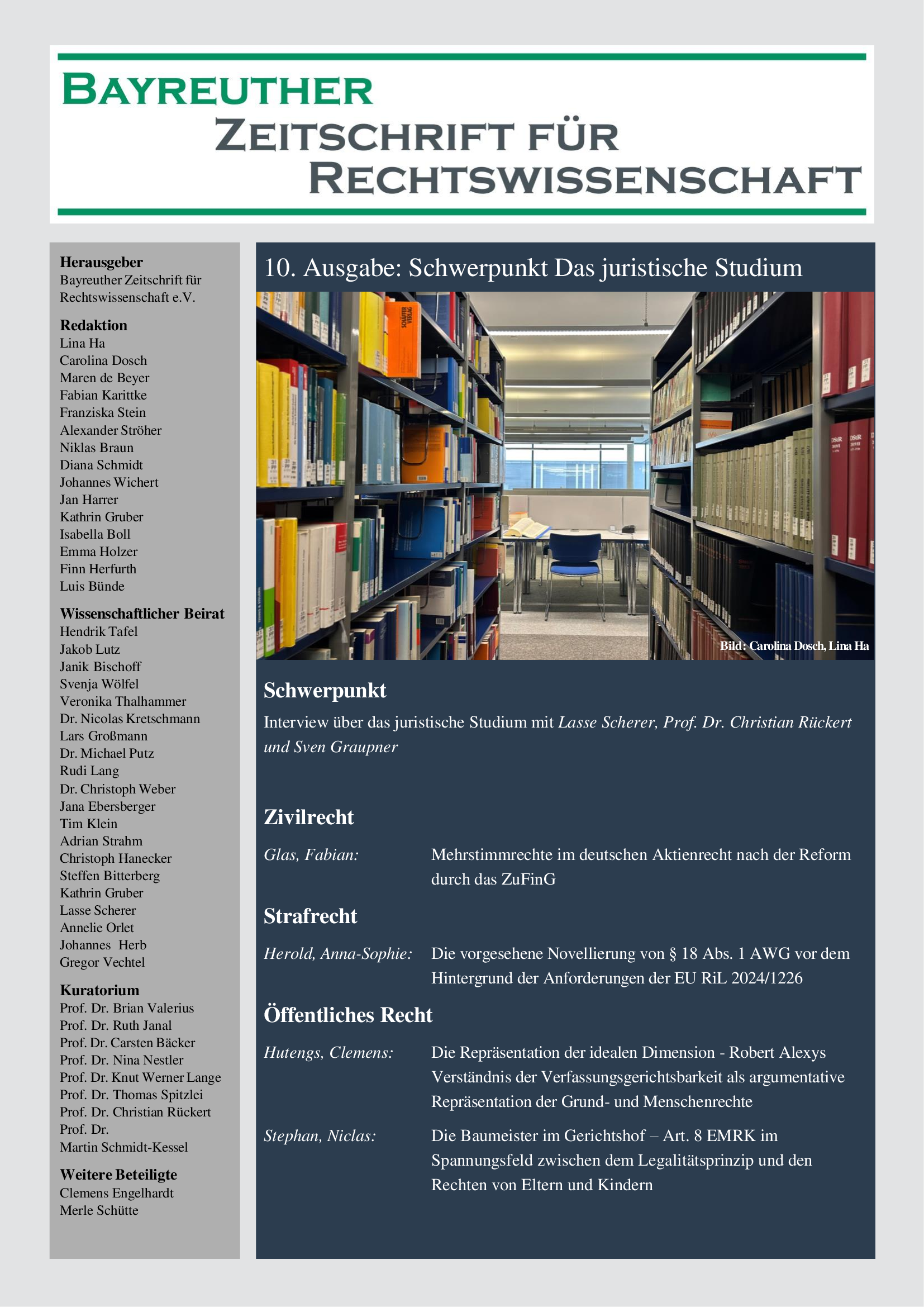 Die 10. Ausgabe der BayZR markiert ein besonderes Jubiläum und stellt zugleich die letzte Ausgabe der Zeitschrift dar. Sie ist einem Thema gewidmet, das alle Jura-Studierenden in besonderer Weise begleitet: dem Lernen im juristischen Studium. Im Mittelpunkt dieser Ausgabe steht die Frage, wie juristisches Wissen nachhaltig erworben, vertieft und erfolgreich angewendet werden kann. Im Schwerpunktinterview geben Lasse Scherer, Prof. Dr. Christian Rückert und Sven Graupner Einblicke in das Lernen in den unterschiedlichen Phasen des Jura-Studiums.